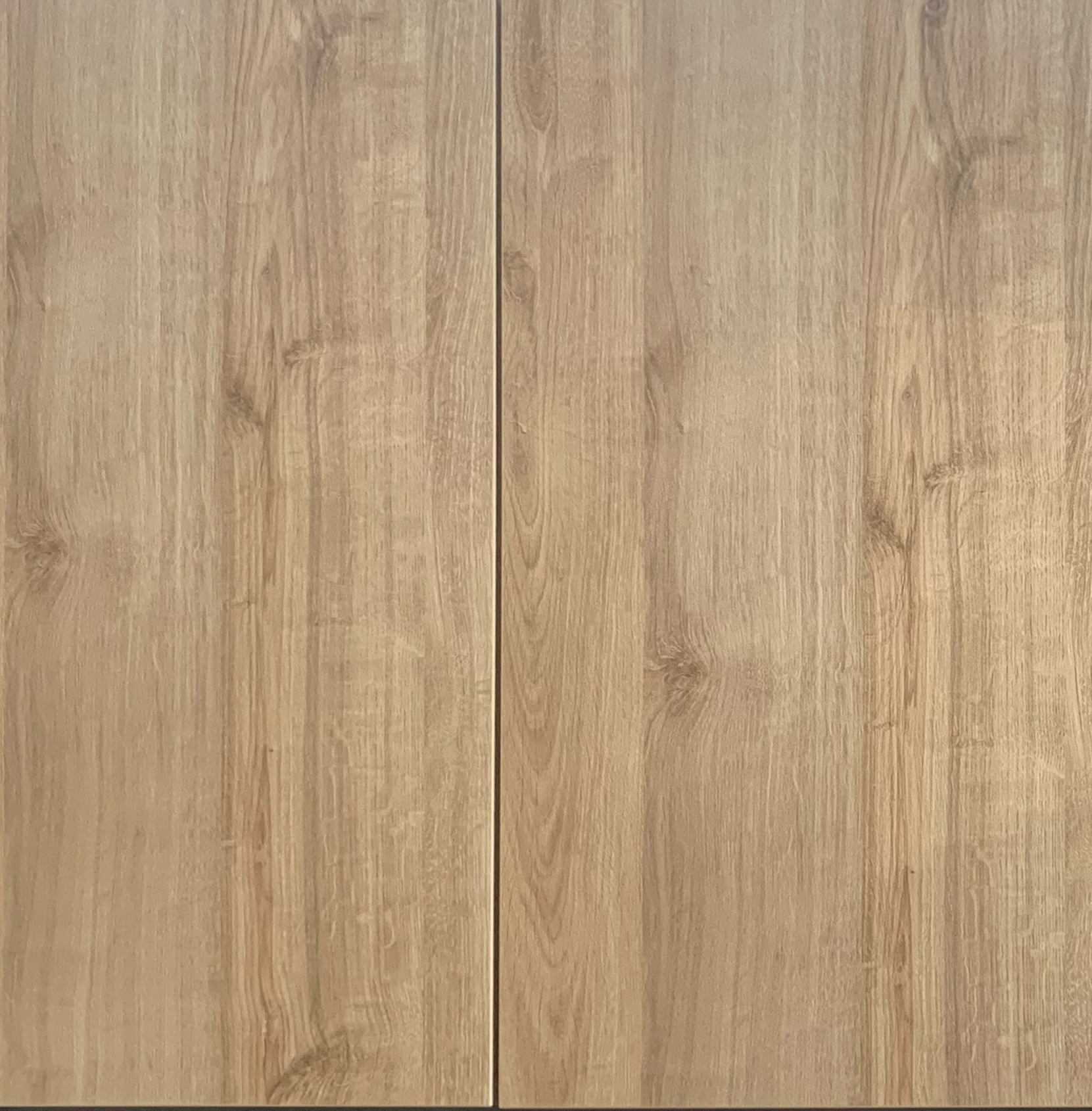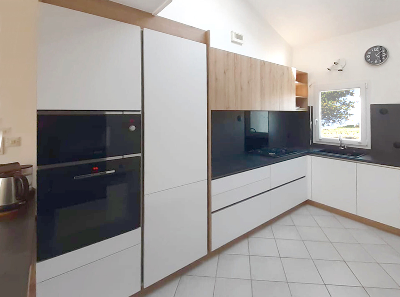 Finitions modernes, poignées intégrées, et touches chêne pour apporter un aspect chaleureux.