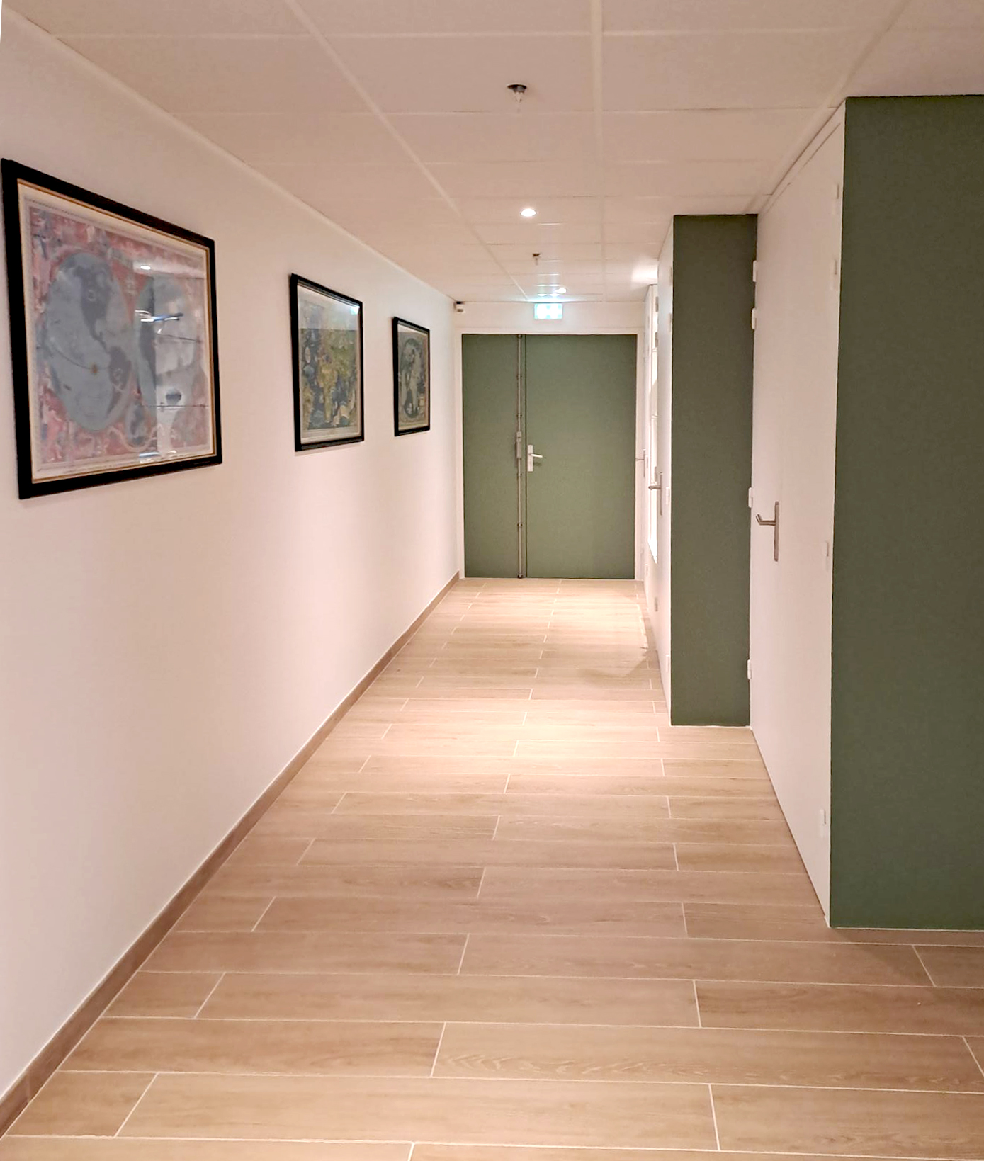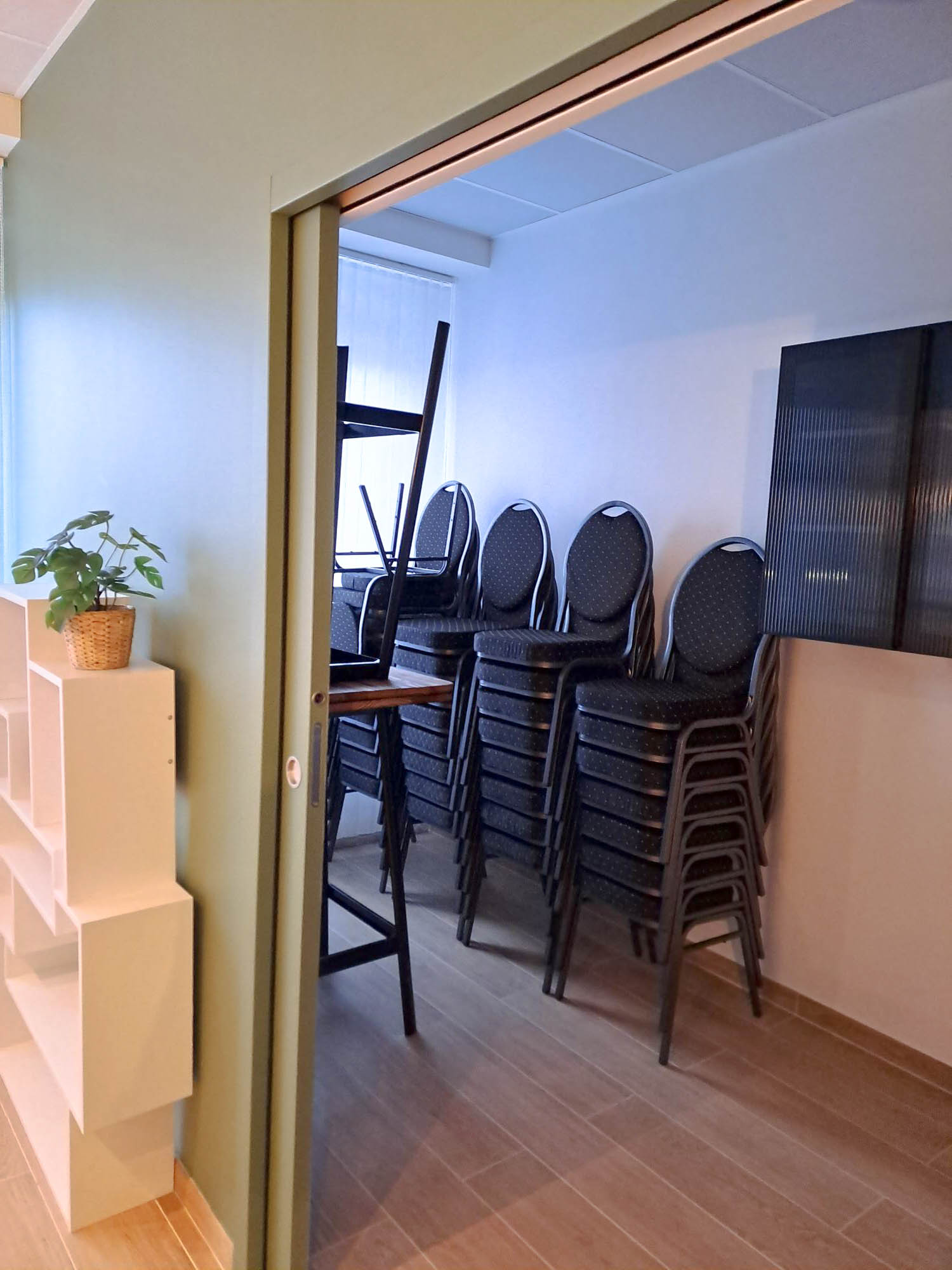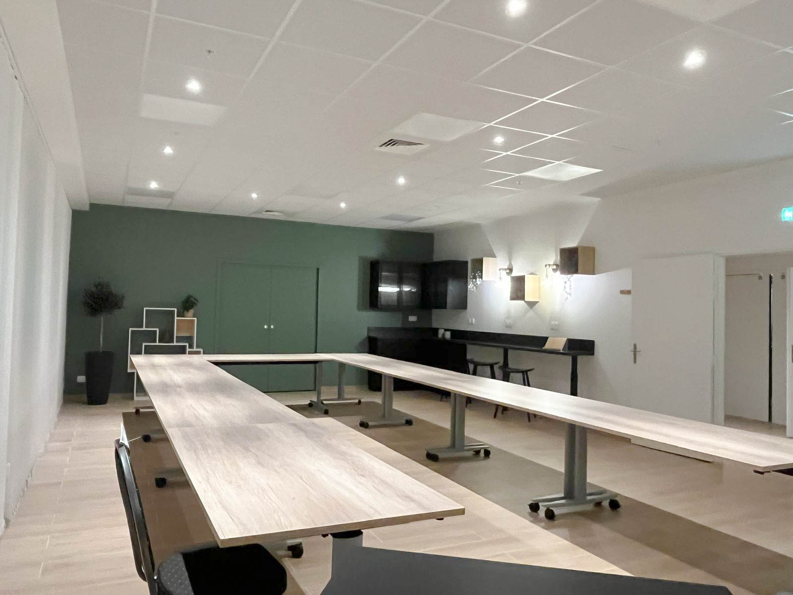 Une salle de réunion dans un bâtiment année 70. Le client souhaitait moderniser et aménager cette salle pour en faire un lieu polyvalent. Il s’agissait en outre de créer un espace de stockage.